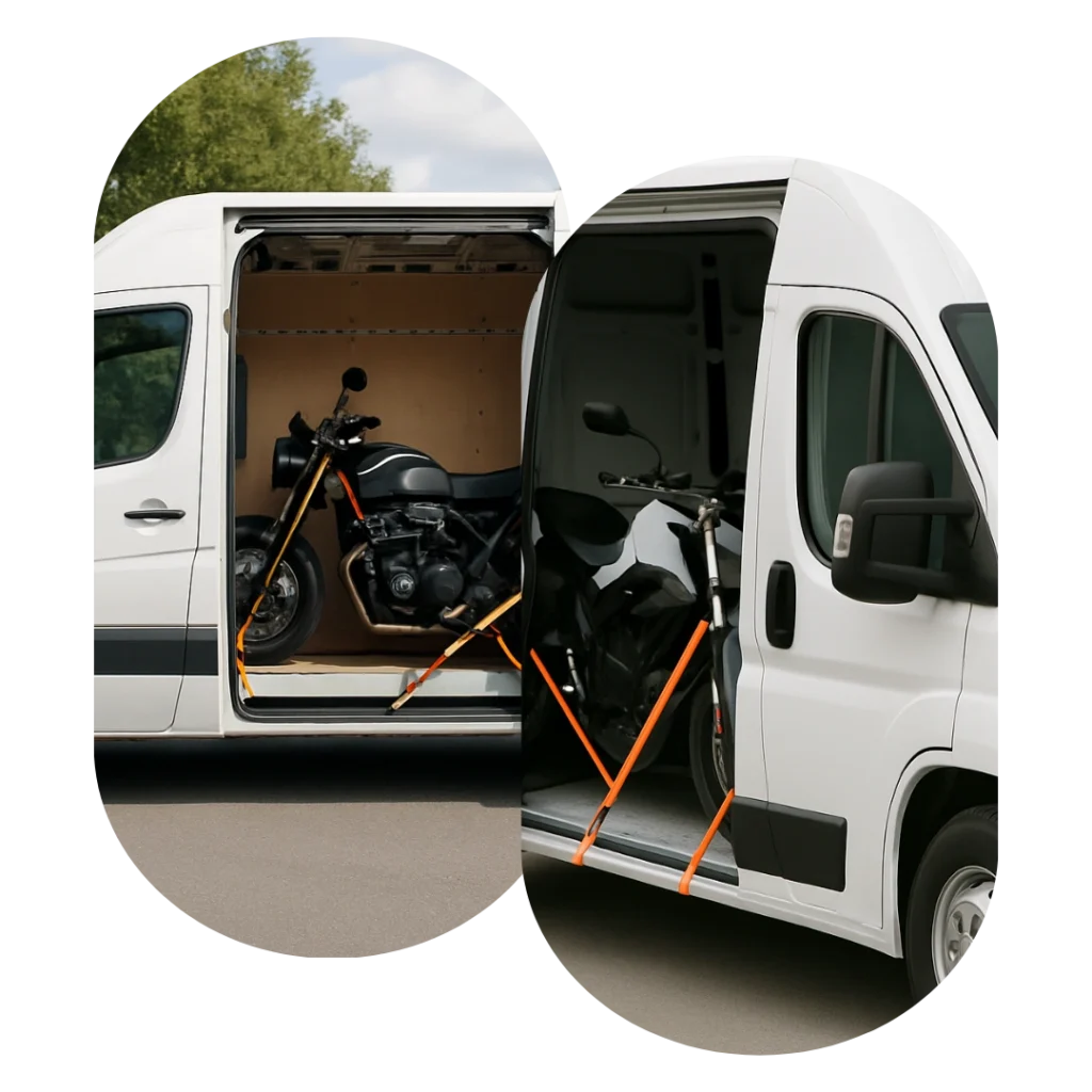 We use professional-grade motorcycle securing systems including wheel chocks, tie-down straps, and specialized equipment designed specifically for motorcycle transport. Multiple securing points distribute forces safely across the motorcycle frame while protective padding prevents scratches or damage to fairings, tanks, and other components during transport.